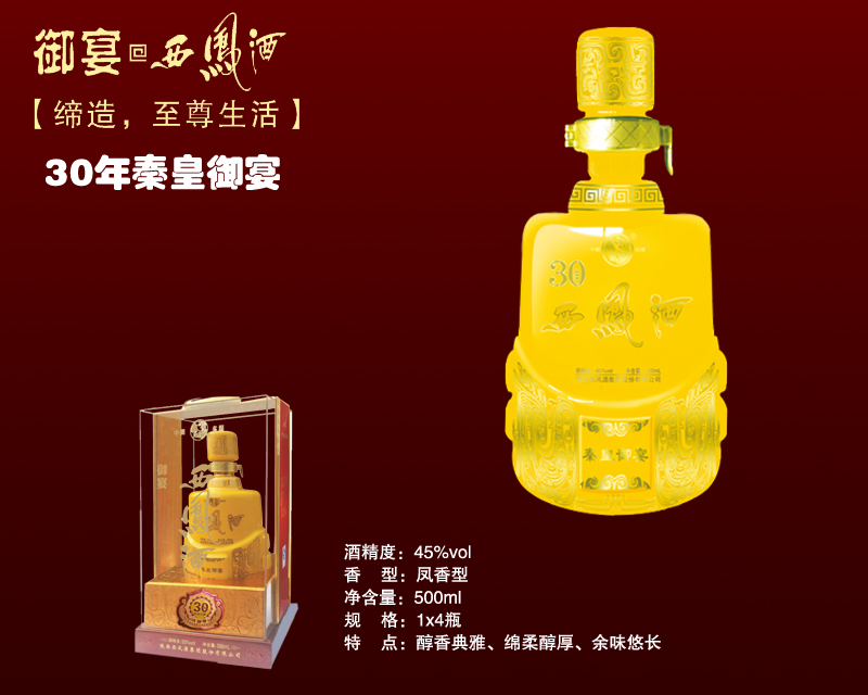 據載,秦王嬴政二十五年五月,秦破燕,嬴政下令,大擺御宴,與文武百官開懷暢飲。秦王大悅,下令將西鳳酒作為皇室御宴用酒。同年七月,秦破齊,至此,六國盡滅,天下統一,秦王以西鳳酒為開國登基大典用酒。從此,“御宴酒”便成了秦王朝的宮廷用酒,西鳳御宴酒由此得名。酒海封藏了30年的秦皇御宴酒,保留著西鳳酒最獨特的鳳香,酒質清亮透明,醇香芬芳,清而不淡,濃而不艷,回味舒暢,風格獨特。 在北京“華樽杯”第二屆我國酒類企業品牌價值評議頒獎會上,陜西西鳳酒被授予“中華白酒十大*代表性品牌”,并宣布西鳳酒集團股份有限公司為“我國該酒申請國家暨*非物質文化遺產發起人之一”。 領頭羊愛喝、白領愛喝、老人愛喝、企業事業單位必備、居家必備、喜宴必備、慶功宴要喝、會議上要喝、日常生活要喝,天天都有需求! 御宴西鳳酒50年,度數:55vol,香型:鳳香型,凈含量:500ml。內瓶質地湘醴陶瓷,瓶體大氣、尊貴,以我國紅為主色調,盒體簡約、氣派,視覺沖擊力強、價值感高,彰顯一代帝王風采,是其高端商務用酒,為高品位人士量身打造,代表高貴與涵養,不失為經典之作。其口感:醇香典雅、綿柔醇厚、余味悠長。 御宴西鳳酒十大系列款款爆銷,如此市場怎能不賺錢?